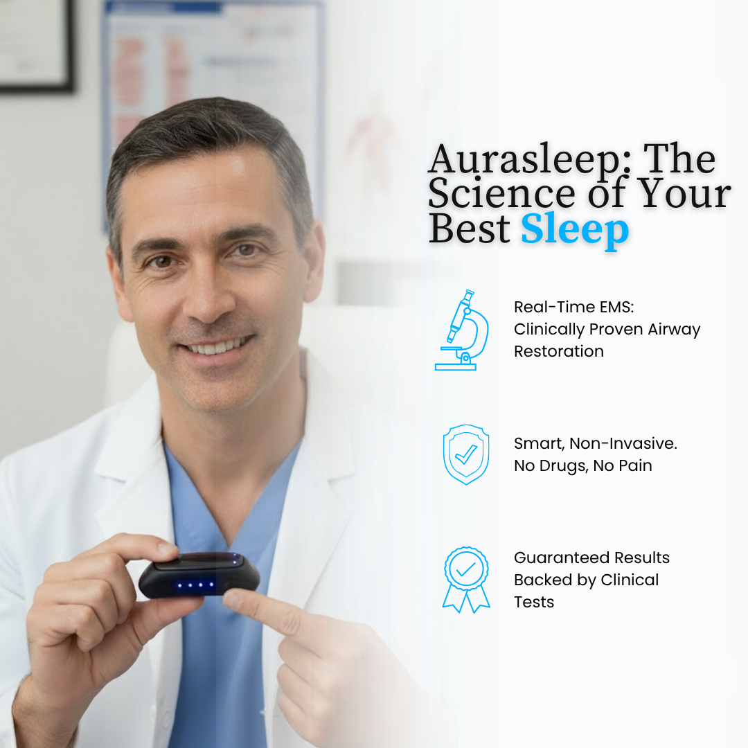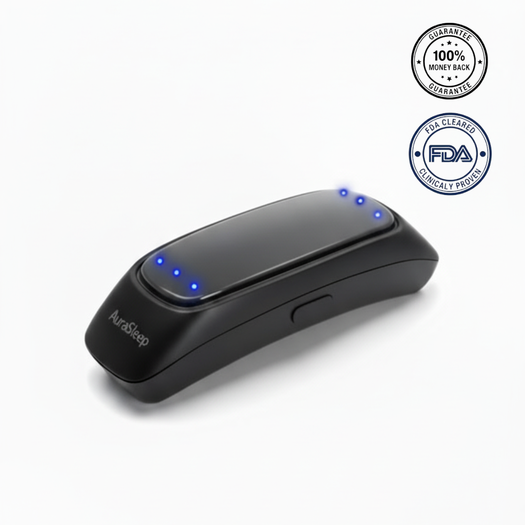 The AuraSleep™ Airway Rebuilder is the revolutionary antidote. Using clinically proven EMS technology, we target the root cause by strengthening your throat muscles, guaranteeing you sleep silently and freely, without ever wearing anything to bed.